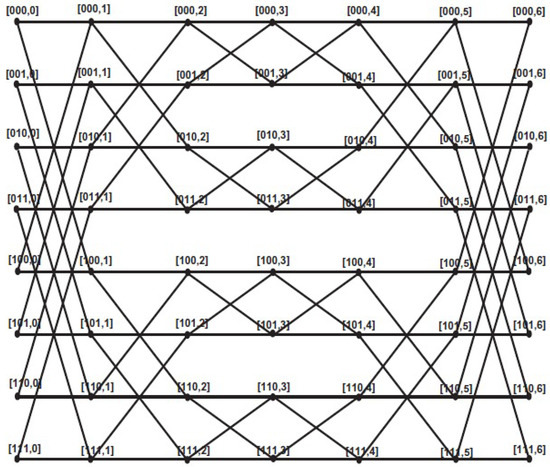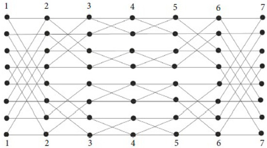 Before proceeding further, we describe the graph associated to networks , , and , with . An -dimensional butterfly network consists of the vertex set V with elements in which v is an -bit binary number representing the row of the node and . The edge between any two vertices and exists if and only if and either or v, differ in exactly the ith bit. Clearly, for and . Further, an -dimensional Benes network is obtained by connecting back-to-back butterflies . An -dimensional Benes network is denoted by ; for example, is shown in Figure 1. Further, and . For more regarding the structure and construction of butterfly and Benes networks, we refer the readers to [13]. By keeping in view the importance of these networks, Hussain et al. recently introduced some families of graphs obtained by Horizontal and vertical identifications of the Benes network; these new graphs are known as Horizontal Cylindrical and Vertical Cylindrical . In these networks, , , and . For the complete details regarding the structures and , see [20,21] and Figure 2 and Figure 3.