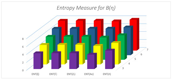 In the current section, we present the complexity analysis by implementing the formulae proved in this manuscript. Similar to the work of Dehmer [44], we apply the formulae of entropy to compare the complexity of the studied networks. Since the Benes network is the core network and the networks and are produced from via horizontal and vertical identifications, the natural comparison could be between the complexity of and , and . In step 1, we present the comparisons of eccentricity-dependent TIs of with corresponding TIs of and via Table 6. It appears that the values of TIs , , and for tend to remain higher than the corresponding values for . However, this trend is reversed for and . The comparison of trends of values of these TIs is similar for and , except the fact that corresponding values remain the same in the case of , and the trend is reversed for .