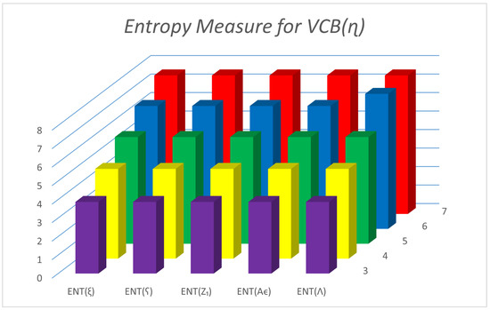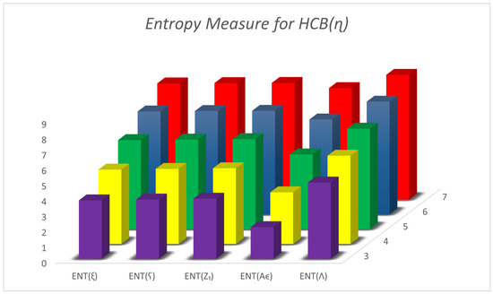 The step 2 analysis is rather more conclusive and informative as it shows applications of the computed formulae of this manuscript in understanding the complexity of the studied networks , and, . The objective is to compare complexities of the network with its derived networks and , separately, by using Table 7. Figure 4 presents the behaviour of entropies from information functionals based on the eccentricity-dependent TIs for , and Figure 5 and Figure 6 show the corresponding trends of entropies for and . Note that these entropies are based on eccentricity-dependent information functionals, and since the Equation (1) proposes a mechanism of producing different entropy formulae, it is also important to know which functionals are more appropriate compared to others so that the more appropriate ones can be promoted to investigate the entropy measures or implicative complexity or other properties of other significant families of the networks. While analysing entropies of and , we note that the entropies produced from , , , and demonstrate a significant pattern. Elaborating this pattern in terms of complexity suggests that the structure is less complex compared to . However, this pattern is opposed when we use an information functional based on . Similarly, while comparing the complexities of and , the trends show that is less complex when we use , , , and TIs-based information functionals. However, the trend is the opposite for . As a result, we conclude that information functionals based on , , and produce a significant trend and elaborate complexity comparisons very effectively. Lastly, we point out that the difference of all the entropies is decreasing when we increase the value of . It is also a true reflection because when is large, networks are the same for the most part and only differ on boundaries (Horizontal and vertical).