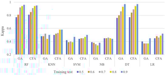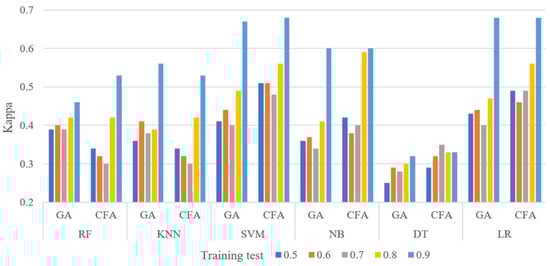 Figure 5 shows the kappa results of the six classifiers for the HFD dataset at different training set levels (0.5 to 0.9). As shown in Figure 5, the CFA provided better results than the GA on the HFD, particularly with RF and DT, because these classifiers depend on ensemble learning algorithms. This suggests the need to use the RF and DT classifiers with larger datasets. This shows that the performance of the classifiers varied across datasets of different sizes. RF and DT outperformed the other classifiers when applied to a larger dataset (HFD), whereas LR, SVM, and NB provided better results for the CFA when applied to the PID dataset.