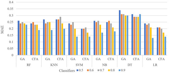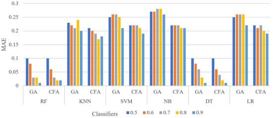 Figure 7 shows the MAE values of the six classifiers for the HFD dataset at different training set levels (0.5 to 0.9) with 50 iterations and 100 as the population size. The CFA provided better results than the GA, particularly with RF and DT. The main reason for this is that DT operates as a series of sequential decisions made to reach a particular output of the importance of features and attribute sequences based on criteria such as the Gini impurity index. The RF leverages the power of multiple DTs to make a decision.
