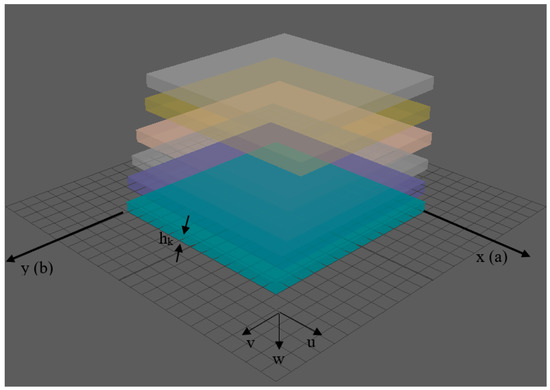 A rectangular plate considered has the Cartesian coordinate system , and , with the plane placed at mid-depth (reference surface) of the plate and taken normal to the plate, as shown in Figure 1. Here, and are the lengths of the sides of the plate along the and directions, respectively, is the total thickness, and is the thickness of the k-th layer of the plate.