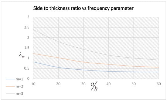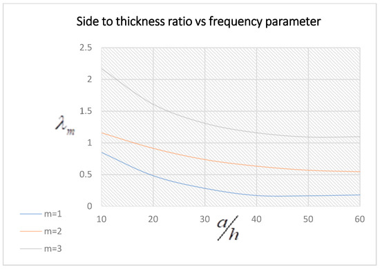 Figure 5, Figure 6 and Figure 7 demonstrate the variation of the side-to-thickness ratio and frequency parameter of plates of different symmetric ply orientations. The curvature of the graph curve elucidates that as the side-to-thickness ratio value increases, the frequency parameter value decreases.