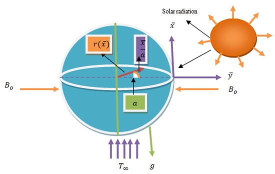 Bulinda et al. [] investigated the magnetohydrodynamic free convective flow process along a corrugated vibrating bottom surface with a focus on the effects of Hall currents. Molla et al. [] considered the impact of varying conductivity on the natural convection over a sphere immersed in quiescent fluid. Alwawi et al. [] presented a study on the MHD natural convection flow of a Casson nanofluid around a solid sphere. Jenifer et al. [] proposed a model of unsteady mixed convection past a sphere with the consideration of magnetic field and variable fluid property effects. Ahmad et al. [] considered the chemically reacting natural convection past a curved surface with varying of the thermal conductivity and dynamic viscosity. Salleh et al. [] considered the mixed convective flow around a sphere by considering the Newtonian heating effect. The effects of varying viscosity and chemical reaction on the natural convection process were investigated by Molla and Hossain []. Chamkha et al. [] numerically modeled a non-Darcy heat transfer of a nanofluid past a porous vertical cone inserted in a permeable medium. Chamkha [] investigated the MHD double diffusion natural convection past a sphere. Sparrow and Gregg [] studied the free and forced convection flows over a flat plate for low Prandtl number values. Zhang et al. [] studied the thermal-mechanical coupling propagation and transient thermal fracture in multilayer coatings. Liu et al. [] considered a 3D solid-air model to simulate heat and mass transfer in vertical double tube heat exchangers. Some other relevant studies related to the current subject can be found in the literature [,,,,,,,,,,,,,,,,].