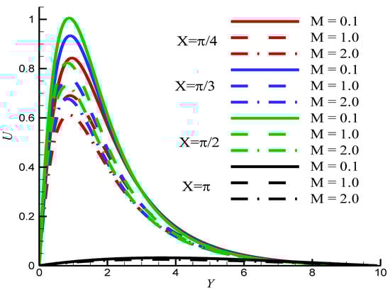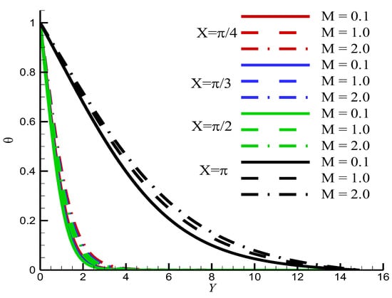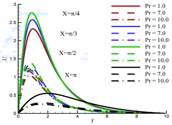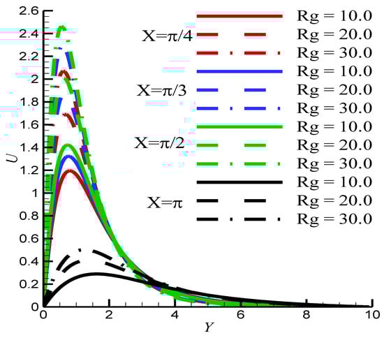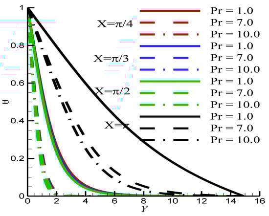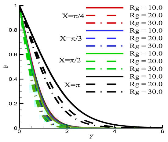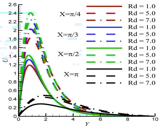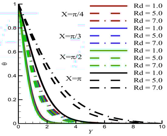 Here, , Pr and are reduced gravity, radiation parameter, Prandtl number, and magnetic field parameter, respectively. Here, is reduced gravity acceleration defined in Equation (12).