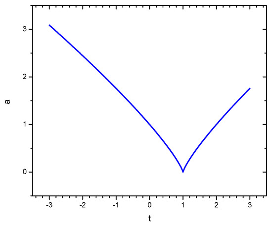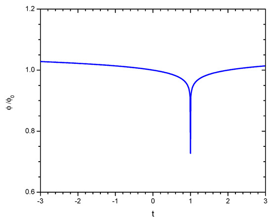 where represents the present epoch value of the scale factor. As usual, the scalar field depends on the scalar factor, increasing correspondingly. The time variation of the Brans–Dicke scalar field is shown in Figure 3. In the pre-bounce epoch, the BD scalar field decayed slowly with time up to the bounce. At the bounce, , the BD scalar field suddenly presented a sharp dip and then bounced with the growth in cosmic time.