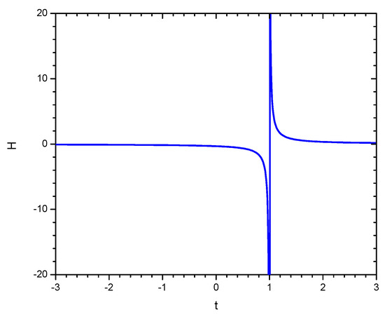 The variation in the scale factor for the superbounce scenario is shown in Figure 1. We considered the parameter space of the scale factor to be , and . The scale factor was observed to decrease from a higher positive value up to ; the bounce occurred at ; and, beyond the epoch , the scale factor started increasing from a lower positive value to a higher positive value. As is apparent from the figure, the decrement in the scale factor prior to the bounce and the increment in the scale factor after the bounce were almost linear for the parameter space used in the present work. In Figure 2, the Hubble parameter is shown for the given superbounce scenario. The Hubble parameter had a singularity at and, while it became positive for , it was negative for the time zone .