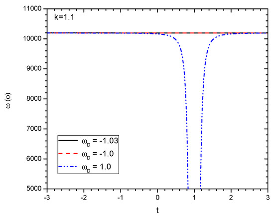 so that and, consequently, the evolving part of the BD parameter vanishes. The BD parameter for this cosmological constant case turned out to be non-evolving with a value of . However, the BD parameter depends on the anisotropic parameter . In fact, in this case, the NEC is not violated, and we should not expect a superbounce scenario. In principle, for this case, a cosmic bounce cannot occur, as the curvatures may build up to a large extent to initiate the gravitational collapse.