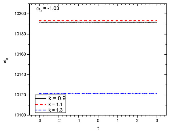 It is obvious that the evolution of and for a given anisotropic parameter k depends on the evolution of the Hubble parameter. In the pre-bounce period, the Hubble parameter is a negative quantity, and it decreases further with an increase in cosmic time up until the bounce occurs, where the Hubble parameter has a large value. However, after the bounce, the Hubble parameter becomes a positive quantity. We may assume the the EoS parameter is a negative quantity with values close to . Such an assumption is in accordance with the observation of the late cosmic acceleration phenomena. Some recent estimates for are [54], [55], and [55]. Constraints from the Supernova cosmology project provided [56], from Planck 2018 results [57], and from Pantheon data [58]. In view of these estimates, the behavior of could be assessed. In the pre-bounce epochs, the magnitude of decreases with time.