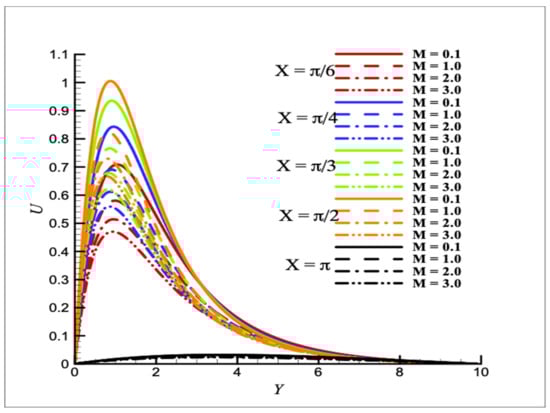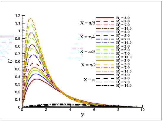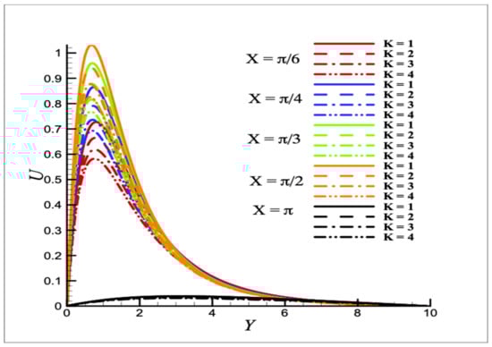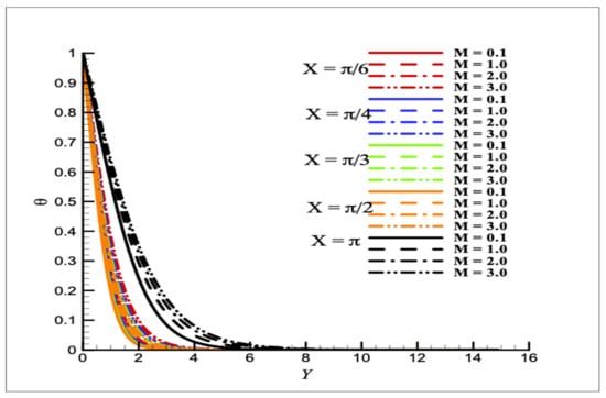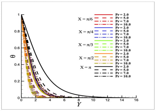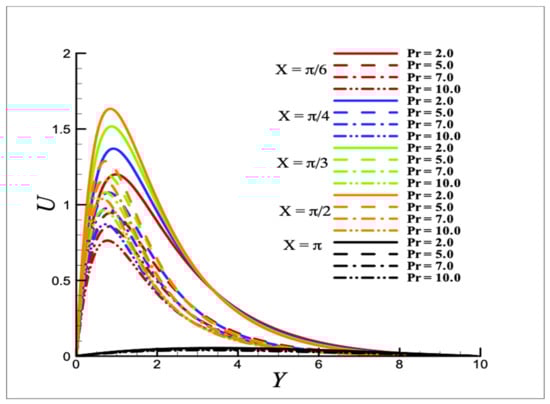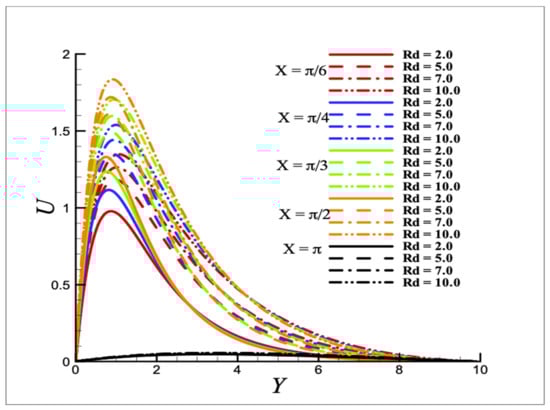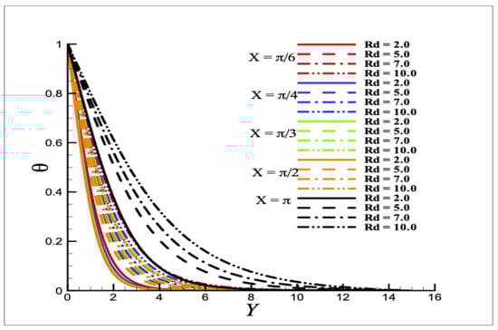Here, , Pr ,  are reduced gravity, the radiation parameter, the Prandtl number, the porosity parameter, and the magnetic field parameter, respectively. Here,  is reduced gravity acceleration defined in Equation (12).