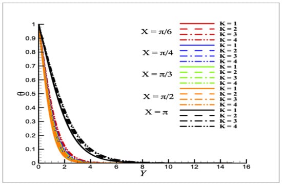 The effects of the reduced gravity parameter  on the velocity profile  for Prandtl number  = 7.0 at various points on the sphere are shown in Figure 2. The graph shows that when  is improved, the velocity profile  increases. The numerical results of fluid temperature for various values of  are shown in Figure 3. The temperature curves show that the fluid temperature rapidly decreases as  is strengthened, at all the considered points. The maximum temperature magnitude occurs at . From a physical point of view, the increase of the reduced gravity parameter leads to a decrease in thermal expansion and thus a smaller temperature difference between the surface and the surrounding fluid, which results in a decrease in the fluid flow domain’s overall temperature. Figure 4 and Figure 5 present the effect of the porous medium parameter on the velocity and temperature profiles, respectively. Figure 4 highlights the influence of the porous medium parameter  on the velocity field. It shows that as  is increased,  decreases at all the considered positions. Figure 5 depicts the behavior of  for various values of . It is noticed that as  is raised,  increases. The velocity and temperature profiles for various values of the solar radiation parameter  are shown in Figure 6 and Figure 7 at various locations around the sphere. It should be mentioned that velocity and temperature increase when Rd is increased. Physically, these results are due to the enhancement of the overall heat transfer coefficient and absorption efficiency, which contribute to raising the temperature of the fluid flow domain. The effects of the magnetic field parameter  on the temperature and velocity fields are shown in Figure 8 and Figure 9. With the intensification of , it can be observed that the velocity is reduced, and the temperature is increasing. This fact is physically due to the generated Lorentz force caused by the interaction between the magnetic field and the flow motion. This force reduces the flow intensity, and because of the produced viscous resistance, the fluid’s temperature rises.