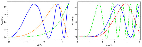 Up to now, all our considerations have been made for arbitrary scale factor . Let us consider the De Sitter form , which is apt to describe inflationary and accelerated expansion stages. The constant , with dimensions of mass, is also known as Hubble parameter. In this case, and . Notice that the conformal time is, in this metric, always negative, with the late time limit corresponding to . The Equation (36) reads