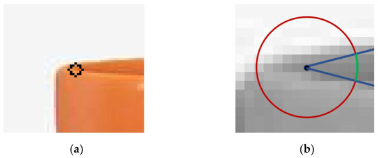 The same obtuse angle key point has a similar pattern. The green line around its circumference is longer than the acute angle, and this point is more valuable as a feature point than other points. Whether you use the Harri [29] or the FAST to find this point, you are, in a sense, using the critical information that this point carries that other points do not. The centre point has a constant value, and the description of the centre point (compared with other neighbouring pixels) cannot be discarded. However, neither BRISK nor ORB makes good use of the value of centroids. Additionally, the process of using greedy search to reduce the correlation also breaks the grayscale distribution pattern in the corner point image block.