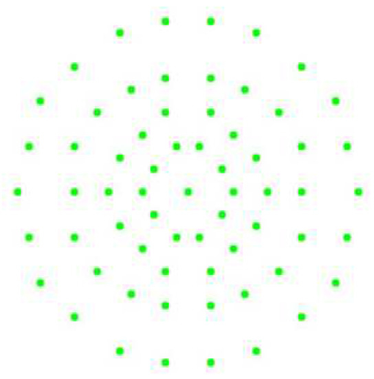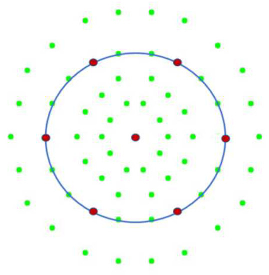 where Equation (3) is the equation of the circumference of the sampling point; is the radius of the rim, ; is the angle of the sampling point on the circumference; refers to the sampling point of each circumference; is the number of sampling points of the circumference, 10, 14, 16, 20. The circumference distribution pattern is shown in Figure 3.