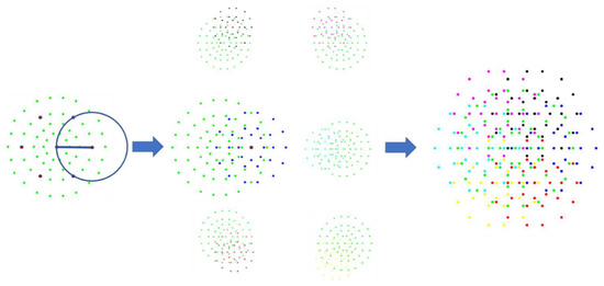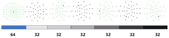 - Firstly, the grey pixel value is compared using the centre point (blue point) with the points with serial numbers from 1 to 64, in order from smallest to largest, as shown in Equation (1) (where is the coordinate of the centre point and is the coordinate of the other points). A 64-dimensional binary string is obtained.