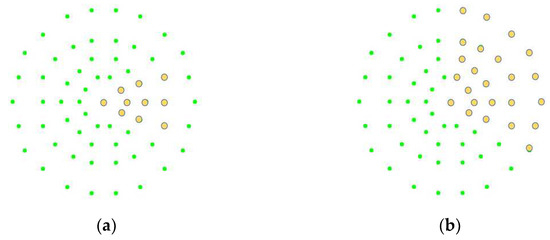 Both symmetrical multicentre circumferential coding and parity coding initially depicted the shape of the corner while comparing the symmetrical circumferential distribution of the centroid points in the main description. At the same time, the appropriate neighbourhood can better describe its shape and express the correlation of the gray neighbourhood values, as shown in Figure 8, where the yellow dots are coded one, and the green dots are coded 0.