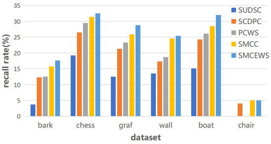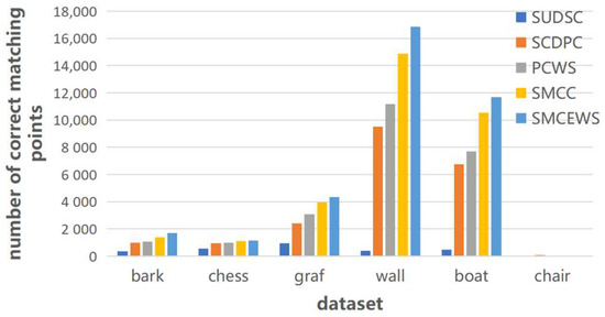 Table 1 shows the experimental results of several different descriptor coding methods, and we visualised the effects of various descriptor coding methods through histograms in Figure 9 and Figure 10. The scheme based on symmetrical multicentre coding with weighted summation has an average increase of 5500, 2516, 1950, and 648 in the number of correct points without limiting the number of feature points, and an average increase of 12.9%, 5.9%, 5.2%, 1.7% in the thousand-point recall rate, respectively, compared with the SUDSC, SCDPC, PCWS, and SMCC. The above experimental results verify the effectiveness of the symmetrical circular distribution strategy, the symmetric multi-description centre strategy, the symmetric multicentre encoding algorithm, and the weighted summation algorithm. The scheme SMCEWS performed the best in all experiments.