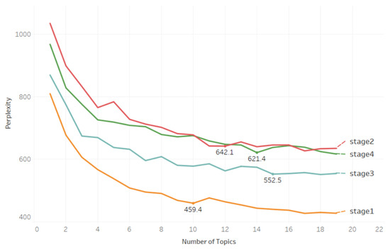 We calculated the perplexity of the global and four-stage datasets to obtain the optimal number of topics. To prevent the overfitting phenomenon, we selected the values where the decrease in perplexity was not obvious or at the inflection point. The trend of perplexity is shown in Figure 2. We finally determined the optimal number of global topics and the four-stage topics were, respectively, 21, 10, 12, 15, and 14. Additionally, we calculated that C was 0.79, which met the topic consistency criterion.