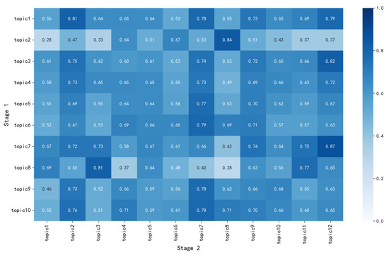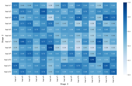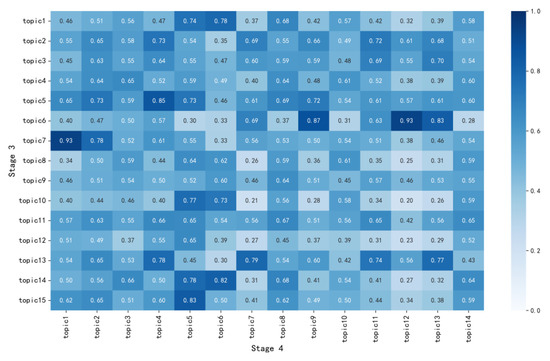 After extracting topics by LDA, we calculated the similarity using Equations (2)–(4) and formed similarity matrices between adjacent stage topics (see Figure 3, Figure 4 and Figure 5). According to the matrices, we calculated the average of the topic similarity between adjacent stages. When we took the value 0.67 as the threshold, which was the maximum similarity average value of the selected stages based on the experiments, most topics showed a clear evolution type among topics.