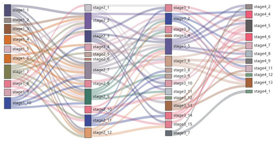 After similarity calculation and topic evolution type determination, we constructed the stage topic evolution paths, as shown in Figure 6. The Sankey diagram visually and clearly shows the topic evolution process in the whole life cycle of the data security domain as of October 2022. The horizontal flow of the Sankey diagram depicts the type and process of topic evolution at four stages, and the vertical element blocks represent the distribution and importance of topics at each stage. We selected some of the topic words to characterize the topics in our analysis.