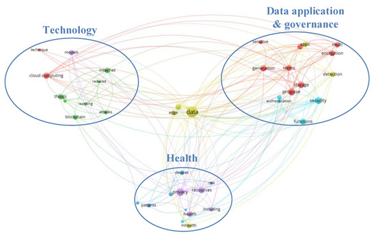 To select significant topic evolution paths, we co-occurred with the LDA clustering results of global topics from the overall perspective of topic evolution in the field of data security to obtain a co-occurrence matrix of size 39 × 39. Then, we used Ucinet to convert the co-occurrence matrix into Pajek format, which was later imported into VOSviewer to map out the topic word co-occurrence mapping of data security. We eventually extracted three important influencing factors, namely health, technology, and data application, and governance. These topics with high relevance and impact are characterized by research continuity and growth, and therefore are the focus of attention in the field of data security, and the visualization result is shown in Figure 7.