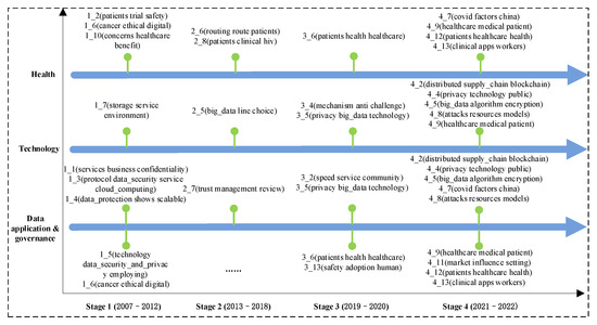 The first is the topic evolution path of data security in healthcare, in which division-type topics account for the majority. These topics mainly involve data security issues, such as user health data privacy, medical ethics, and electronic health data throughout the whole evolution path, reflecting the heat and importance of topic research on health data security [32]. Among them, stage 4_13 (clinical app workers) belongs to the newborn topic. In the context of big data and the COVID-19 outbreak, various algorithm-driven medical and health applications emerged in large numbers, providing people with health information services while hiding various security risks, which became a hot research issue for scholars nowadays.