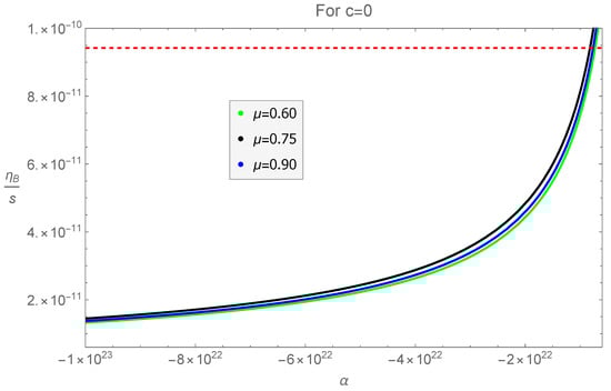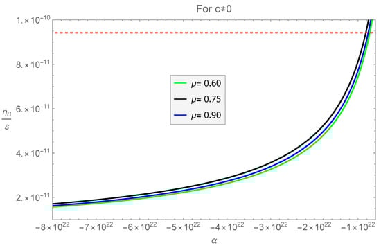 where the prime denotes the derivative of the respective function with respect to the argument. Here, c is the constant of integration. One can find [56], but it has been claimed in [59] that c will not always vanish in a local region. In the region where , the term may be considered as dark matter (DM). Latterly, we consider both cases of c to analyze the scenario of gravitational baryogenesis. The value of the argument from Equation (6) reduces to
