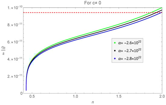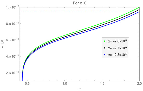 In Figure 1, has been plotted versus parameter for different values of parameter , which belongs to real numbers. For this evaluation, the integration constant c in Equation.(7) is taken to be non-zero (i.e., ) and the other parameters are , , , , GeV, , and GeV. The graph represents that this ratio remains less than , up to when remains less then , which shows consistency with the latest observational data [1,2]. Figure 2 represents the graph of against parameter n for different values of , as mentioned in the panel. All other constants chosen are the same as in the previous figure. The graph shows that the inspected ratio remains < up to when , resulting in compatibility with the observational data [1,2].