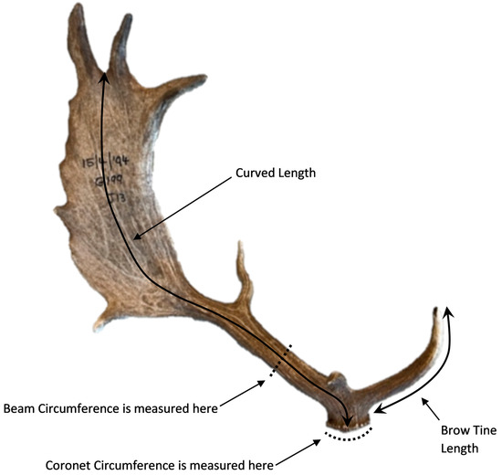 A fallow deer antler showing the four measurements taken (mm) for the composite scores for antler fluctuating asymmetry and size.