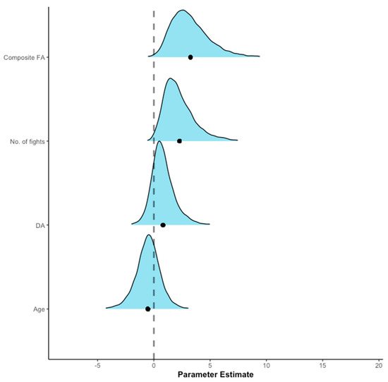 Relationship between antler damage and antler symmetry. A preliminary GLMM investigated the relationship between age and the two measures of antler symmetry (FA and DA (raw data: mean = 1.59 mm, s.d. = 5.55)); there was a very weak negative relationship between the posterior distributions for the two symmetry measures (r = −0.10), and the analysis indicated that age was positively associated with FA (mean = 0.36, s.d. = 0.16, 95% CI = 0.05, 0.67, Px = 1.03%) but not with DA (mean = 0.02, s.d. = 0.11, 95% CI = −0.19, 0.23, Px = 43.26%, R2 = 0.63). A logistic regression investigated the relationship between antler damage and the two symmetry predictors, number of fights each individual engaged in and their age. The relationship between the posterior distribution of the fixed effects was either weak or very weak: the strongest correlation was between FA and number of fights, r = 0.46, and weakest correlation was between DA and age, r = 0.01). The model indicated that there was a positive association between antler damage and a composite measure of FA (mean = 3.25, s.d. = 1.77; 95% CI = 0.62, 7.48; Px = 0.72%) and the number of fights engaged in (mean = 2.28, s.d. = 1.49, 95% CI = 0.26, 6.01; Px = 1.08%, Figure 2). There was no meaningful effect of DA (mean = 0.82, s.d. = 1.07; 95% CI = −0.94, 3.33; Px = 20.08%), or age (mean = −0.53, s.d. = 1.12, 95% CI = −2.88, 1.68; Px = 70.05%). Therefore, fluctuating asymmetry and fighting were associated with higher probability of structural damage than either directional asymmetry or individual age.