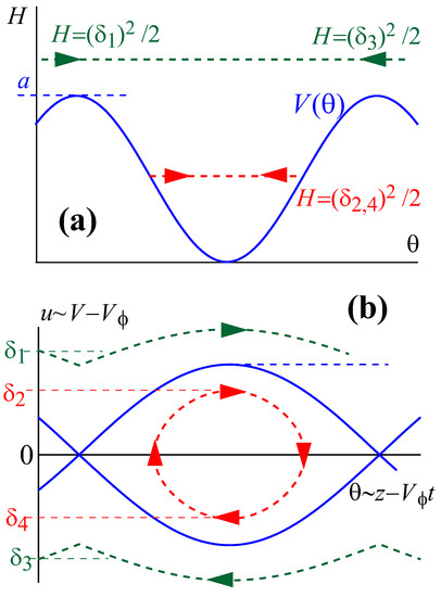 Here, we stay within the simple standard model and treat the motion of a particle as prescribed by the aforementioned Newtonian formalism. Figure 2 illustrates the corresponding phase plane motion along lines , where electrons with move along infinite trajectories, whereas particles with perform finite oscillations inside of the separatrix (“bucket”).