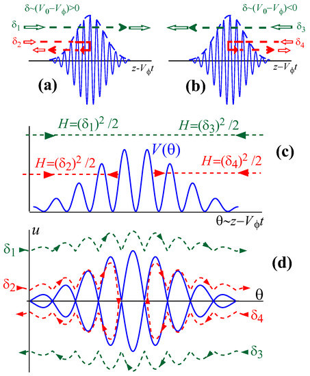 Let us consider two particles with () that catch up with the wave pulse (they approach it in Figure 3a on the left). The particle “1” with a relatively high velocity of passes through the wave pulse without reflection, and thus, its final velocity coincides with the initial one of . In contrast, the particle “2” with a lower velocity of cannot overcome the potential barrier at a certain point inside the pulse. Thus, it is reflected from the wave pulse. According to Equation (7), its final normalized velocity is . A similar situation occurs for two particles with initial velocities lower than the group velocity of the wave pulse (that is, with negative detuning ). They approach the wave pulse from the right (Figure 3b), and the particle “3” (which has a large mismatch of ) passes through the pulse with no change in the normalized velocity whereas the particle “4” with a relatively small mismatch of is reflected from it (Figure 3c,d) with the final normalized velocity .