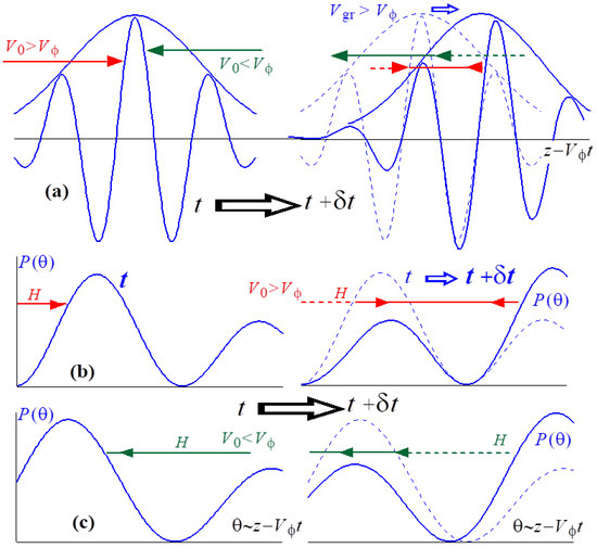 In addition, slowly shifts in the positive direction of the axis . Let us consider the behavior of two particles with and that are relatively close to the electron wave resonance . These electrons are analogous to the “symmetrical” particles with and shown in Figure 3, and therefore, when , they should be reflected from the wave pulse. When , the symmetry is broken because, with respect to the coordinate , the envelope of the wave pulse (Figure 5a) and the potential relief (Figure 5b,c) slowly move forward. Therefore, “from the point of view” of the faster (, ) particle (Figure 5b), the potential relief moves co-directionally to the movement of this particle with a low relative velocity of
