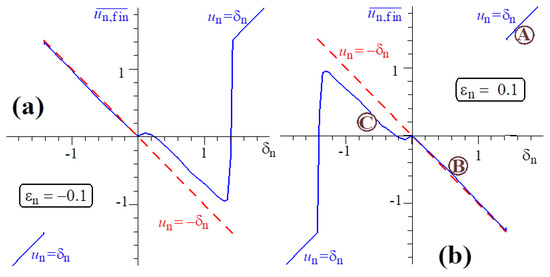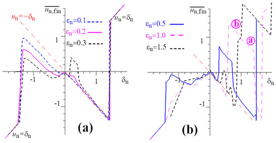 Figure 6 compares the cases of the slippage parameters and . In these simulations, as an example, we considered the case where the normalized length of the wave pulse, 2L, corresponds to eight wave circles, but the results were almost independent on this length. Naturally, we saw two mutually symmetric pictures. For negative , the symmetry of the dependence was disturbed in the range where are positive and correspond to reflections , whereas for positive , we saw the same perturbations in the range (compare with Figure 4). Evidently, in the case illustrated in Figure 6a,