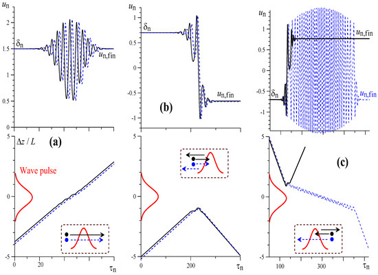 Finally, the case in which (Figure 7c) corresponds to the case where all electrons have negative normalized initial velocities corresponding to the reflection from the potential barrier (point C in Figure 6b). Here, the simulations predicted two kinds of behavior for the particles with different initial phases with respect to the wave pulse. The “proper” particles (solid black curves in Figure 7c) are really reflected, and at the end of the electron wave interaction, their velocity is . However, there are also the “wrong” particles (dashed blue curves in Figure 7c) that pass through the potential barrier, and their final normalized velocity is approximately equal to the initial one, . Because the difference between and the calculated value of in this case is ~0.2 (Figure 6c), it is easy to calculate that the share of the “wrong” particles in this case is close to 15%.