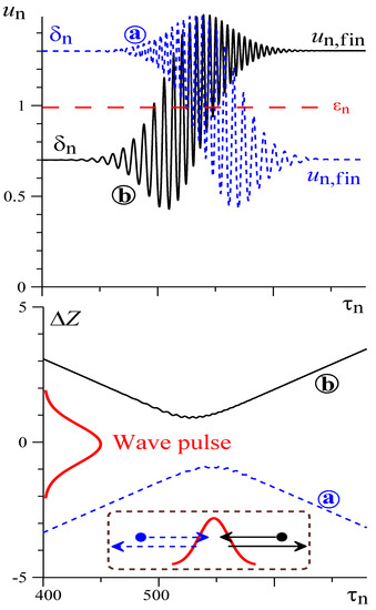 This means that for a positive slippage factor, i.e., , the electron flow passes a part of its energy to the wave pulse, and therefore, it amplifies this pulse. In contrast, if the slippage factor is negative, i.e., , then the symmetry is broken due to the incomplete reflection from the wave pulse of the faster (, ) particles (Figure 4c), and in this case, the electron flow absorbs the energy of the wave pulse