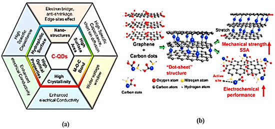 (a) An image of the dot-sheet porous structure made of graphene and carbon dots, as well as (b) a schematic highlighting the virtues of C-QD composites for supercapacitor (SC) applications that should be explored, are both taken from Ref [28].