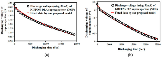 (a) Discharging data of KEMET supercapacitor and fitted by proposed model [19]; (b) discharging data of EECF5RH105 Panasonic supercapacitor and fitted by proposed model [20].