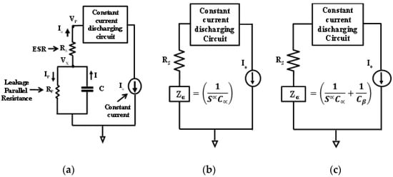 (a) Equivalent circuit of a conventional supercapacitor; (b) equivalent circuit of R-CPE model of supercapacitor; (c) equivalent circuit model of R-CPE-C model of supercapacitor.