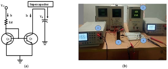 (a) Constant current discharging circuit of the supercapacitor. (b) Experimental setup of the charging and discharging of the supercapacitor.