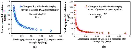 (a) Change of leakage parallel (Rp) with the discharge current of the NIPPON supercapacitor; (b) change of the leakage parallel resistance with the discharge current of the Green-Cap supercapacitor.