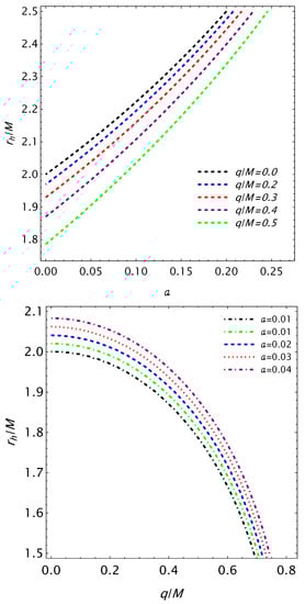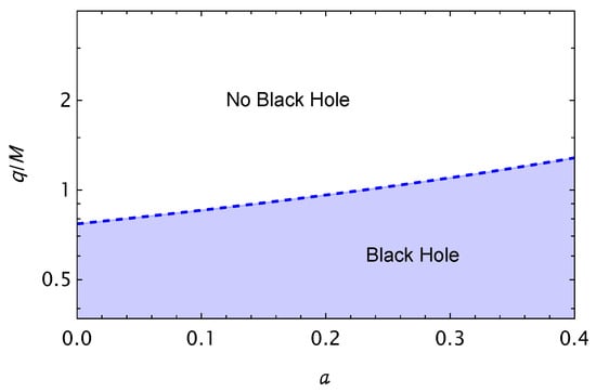 where q is the electric charge, M is the black hole’s mass, and a represents the string cloud parameter. Now, using a cloud of strings and Bardeen gravity, it is possible to examine the structure of a black hole’s horizon. To investigate it, one must examine the properties of the lapse function of the metric by constraining in order to obtain the structure of the BH horizon. Figure 1 demonstrates how the horizon is changing with the change of the parameter a. One can easily see from Figure 1 that the horizon approaches the central object with an increase in the parameter. On the other hand, the location of the horizon shifts further from the center with an increase in the parameter of string clouds a. Further, the BH’s permitted range for the parameters a and q may be obtained, as seen in Figure 2. Using a cloud string under Bardeen gravity, we determined the existence of BH and non-BH zones and obtained the dependency of the border between them on the BH parameters a and q.