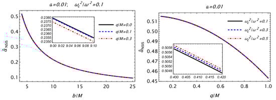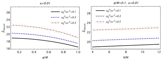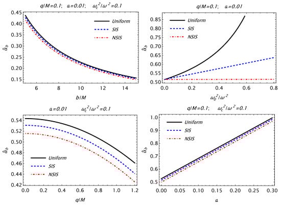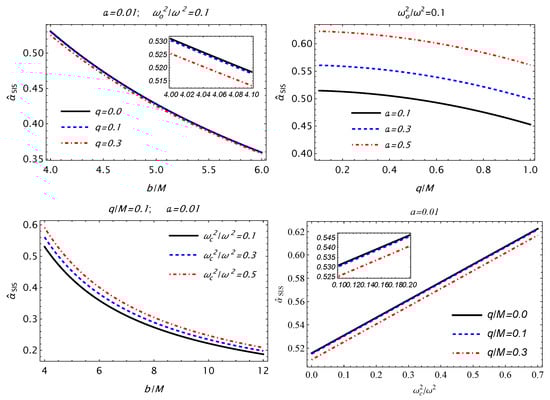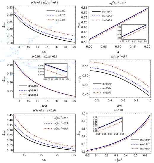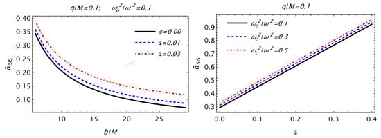 For a wide range of values of a, q, and , the deflection angle of light beams around BH is shown to depend on the impact parameter b in Figure 3. The dependence of the deflection angle on plasma frequency , charge q, and parameter a for fixed values of impact parameter is represented in the other three plots on the right of Figure 3. These graphs suggest that the existence of the plasma properties causes an increasing of the deflection angle of light beams around BH. Further, the angle at which light rays are bent increases when the parameter a is increased. By contrast, with the rise of parameter q, the value of the deflection angle decreases slightly until zero. With increasing impact of parameter b, the gravitational deflection angle approaches zero.