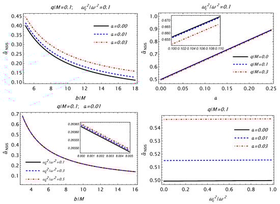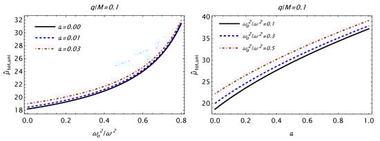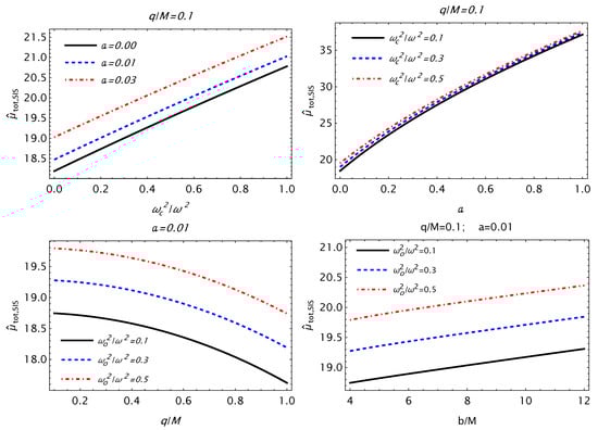 One may graphically represent the relationship between the total magnification and the plasma parameter for various values of parameter a and magnetic charge q using Equation (30). This dependence is presented in Figure 8, and one can see that the total magnification of the image decreases due to the influence of magnetic charge q. Moreover, the total magnification increases with the increase of uniform plasma parameter and parameter a.