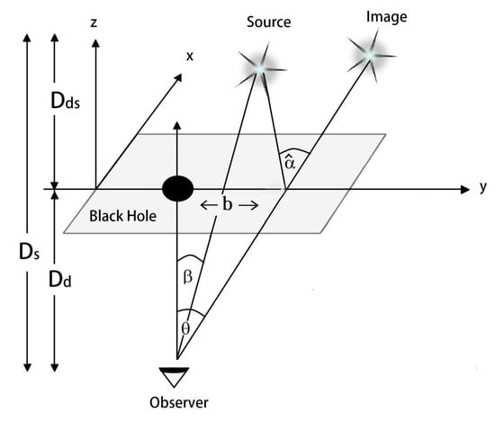 where is the distances from observer to the distant source, and denotes the lens object (see Figure 7). The relation between the angle and the impact parameter b is represented by , where denotes the observer distance from the lens object. By considering such relations, we can write Equation (24) as [,,]