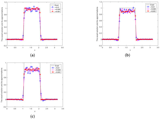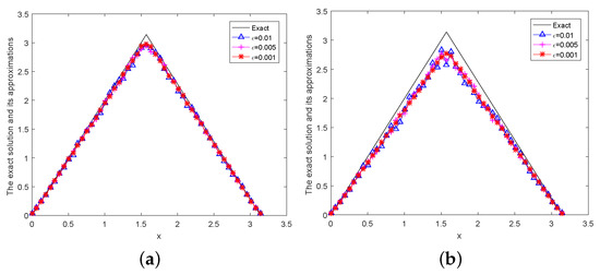 Figure 1 is a comparison between exact solution of the relative error level under Example 1 (smooth function) and its approximate solution under . Figure 2 is a comparison between exact solution of the relative error level under Example 2 (piecewise smooth function) and its approximate solution under . Figure 3 is a comparison between exact solution of the relative error level under Example 3 (non-smooth function) and its approximate solution under .