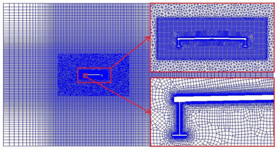 In the wind-induced vibration simulation, the facilities such as the bridge deck guardrail in the completed bridge state are not considered, and transverse members such as beam webs, beams, and stiffeners of steel beams are ignored. Considering the distortion and negative volume of the mesh during the motion of the beam section, the mesh is divided into rigid motion, dynamic mesh, and stationary mesh by blocking. The rigid motion region is the closest to the beam section with a dense grid, which follows the motion of the beam section. The boundary layer grid is set for the main beam section in order to capture the “separation” and “reattachment” phenomena that occur when the airflow flows through the main beam section. Claudio Mannini et al. [22] pointed out that for the SST k-ω turbulence model commonly used in engineering, the value of the dimensionless length parameter y+ should be guaranteed to be around 1 in order to achieve the effect of capturing the flow characteristics of the fluid near the wall. The moving mesh area is set as a larger triangular mesh to solve the mesh quality problem caused by the rigid domain motion. The stationary mesh area is farthest away from the beam section with a larger asymptotic mesh to improve computational efficiency. The grid division after conducting the grid irrelevance test is shown in Figure 6, and the total grid is 182,042.