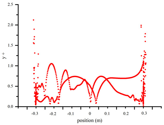 As shown in Figure 7, the distribution of the y+ values of the bridge sections, it can be seen that the dimensionless distance y+ from the center of mass of the grid to the wall is overwhelmingly less than 1. Therefore, the turbulence model adopts the SST k-ω model.