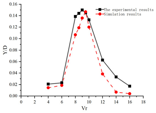 In order to ensure the reliability of the adopted numerical simulation method, numerical simulations are conducted to verify the static wind analysis, vortex-induced vibration analysis, and flutter performance analysis of the π-shaped beam section cable-stayed bridge before they are performed in the paper. Here, due to the length of the paper, each numerical validation process is not developed in detail, as shown in Figure 8, which is a comparison of the experimental results of vortex-induced vibration of rectangular sections with a 1:4 aspect ratio in the paper [23].