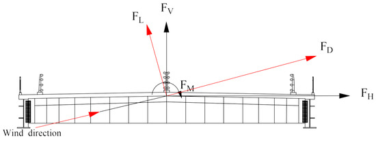 When the bridge is subjected to static wind, the wind speed near the bridge section changes due to the existence of the bridge structure, so a pressure difference is generated between each surface. On the wind axis, the pressure difference between the windward side and the leeward side is integrated to obtain the lateral resistance FD. Similarly, the vertical lift FL and the lift moment MT can be obtained, as shown in Figure 9. The calculation of the three-component force coefficient is shown in Formula (1),